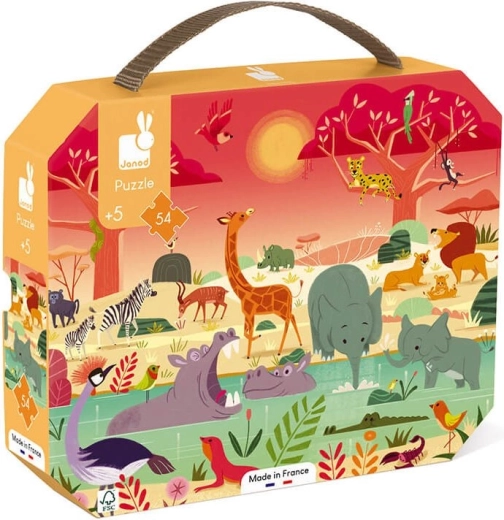 Odkryj radosne układanie z puzzlami JANOD z motywem sawanny w praktycznej walizeczce. Idealne w domu i w podróży, zawierają także plakat jako wzór ułatwiający układanie. 54 elementy, walizeczka z uchwytem oraz wymiar po ułożeniu 50 × 40 cm ucieszą małych miłośników zwierząt i rozwijają cierpliwość oraz małą motorykę.