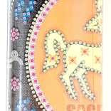 Proces malowania diamentowego: Górna strona płótna jest pokryta klejem i przykryta przezroczystą folią. Usuwaj folię stopniowo, aby utrzymać warstwę klejącą w czystości. Kamyczki z oznaczonego woreczka wysyp do miseczki. Nabierz wosk na końcówkę pióra, aby kamyczki łatwo się trzymały, i nakładaj je na obrazek.