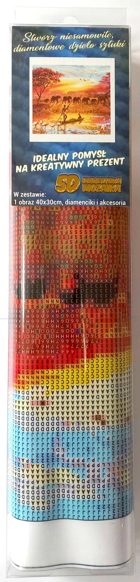 Zawartość opakowania: płótno z nadrukowanym wzorem, pióro do aplikacji kamyczków, miseczka do wysypywania kamyczków, wosk do przyklejania, zestaw kolorowych kamyczków.