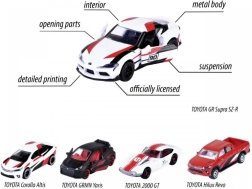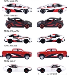 Ten zestaw prezentowy ucieszy każdego fana motorsportu i marki TOYOTA. W opakowaniu znajdziesz pięć legendarnych modeli – GR Supra, GRMN Yaris, Hilux Revo, Corolla Altis i 2000 GT – w spójnym, wyścigowym stylu. Metalowe nadwozia, szczegółowe nadruki i funkcjonalne otwierane elementy nadają samochodzikom realistyczny wygląd.