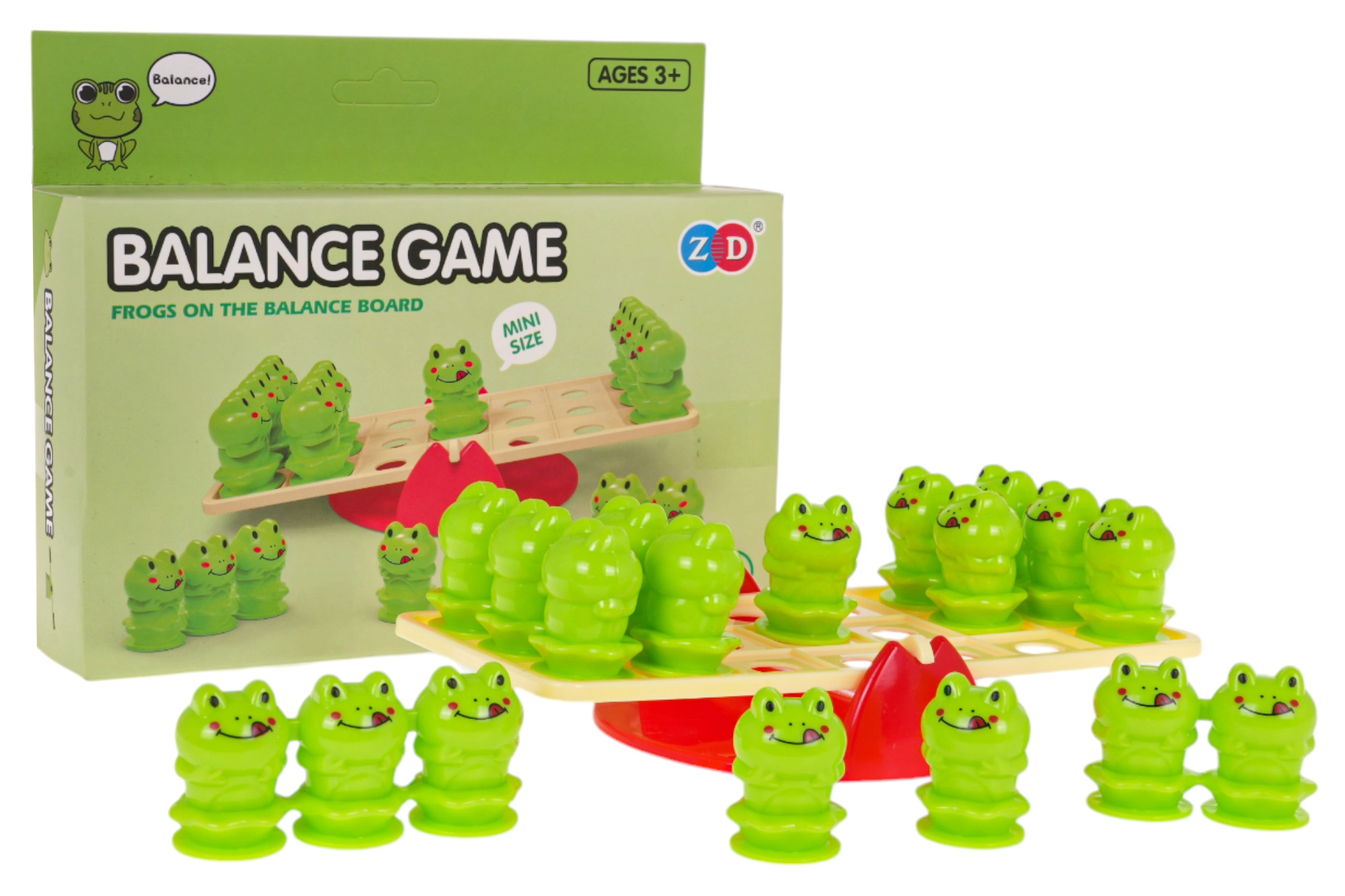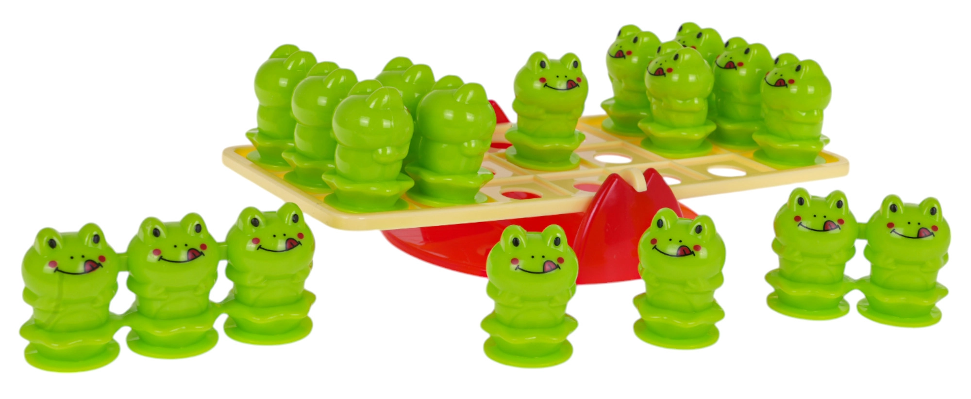 Ta sprytna gra balansowa zapewnia dzieciom długie godziny wartościowej zabawy. Zadaniem jest układać żabki po obu stronach podstawy tak, aby utrzymać równowagę. Dzieci w naturalny sposób zrozumieją zasady dodawania i odejmowania oraz proste zależności fizyczne.