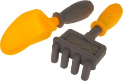 Zestaw zawiera również grabię i łopatkę. Te narzędzia umożliwiają dzieciom kreatywną zabawę i rozwijanie umiejętności budowlanych w piasku lub żwirze.