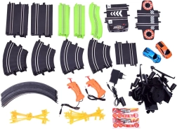 Zestaw zawiera wszystkie niezbędne elementy do wyścigów, takie jak proste odcinki, zakręty, pętle oraz oznaczenia trasy.