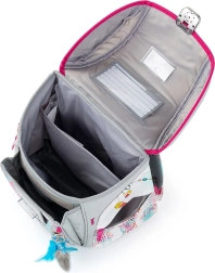 Przemyślany podział zapewnia dużo miejsca na podręczniki, zeszyty i drugie śniadanie. Wewnętrzny rozdzielacz, liczne kieszenie i komory na zamek pomagają utrzymać porządek przez cały szkolny dzień. W zestawie znajduje się także praktyczny worek na strój gimnastyczny ze sznurkami ściągającymi oraz piórnik jednopoziomowy z dwiema klapkami i gumowymi uchwytami.