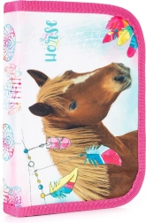 Zestaw obejmuje plecak z elementami odblaskowymi, worek na strój gimnastyczny ze ściąganymi sznurkami oraz piórnik jednopoziomowy bez wyposażenia – wszystko w dopasowanym wzornictwie z motywem konia.