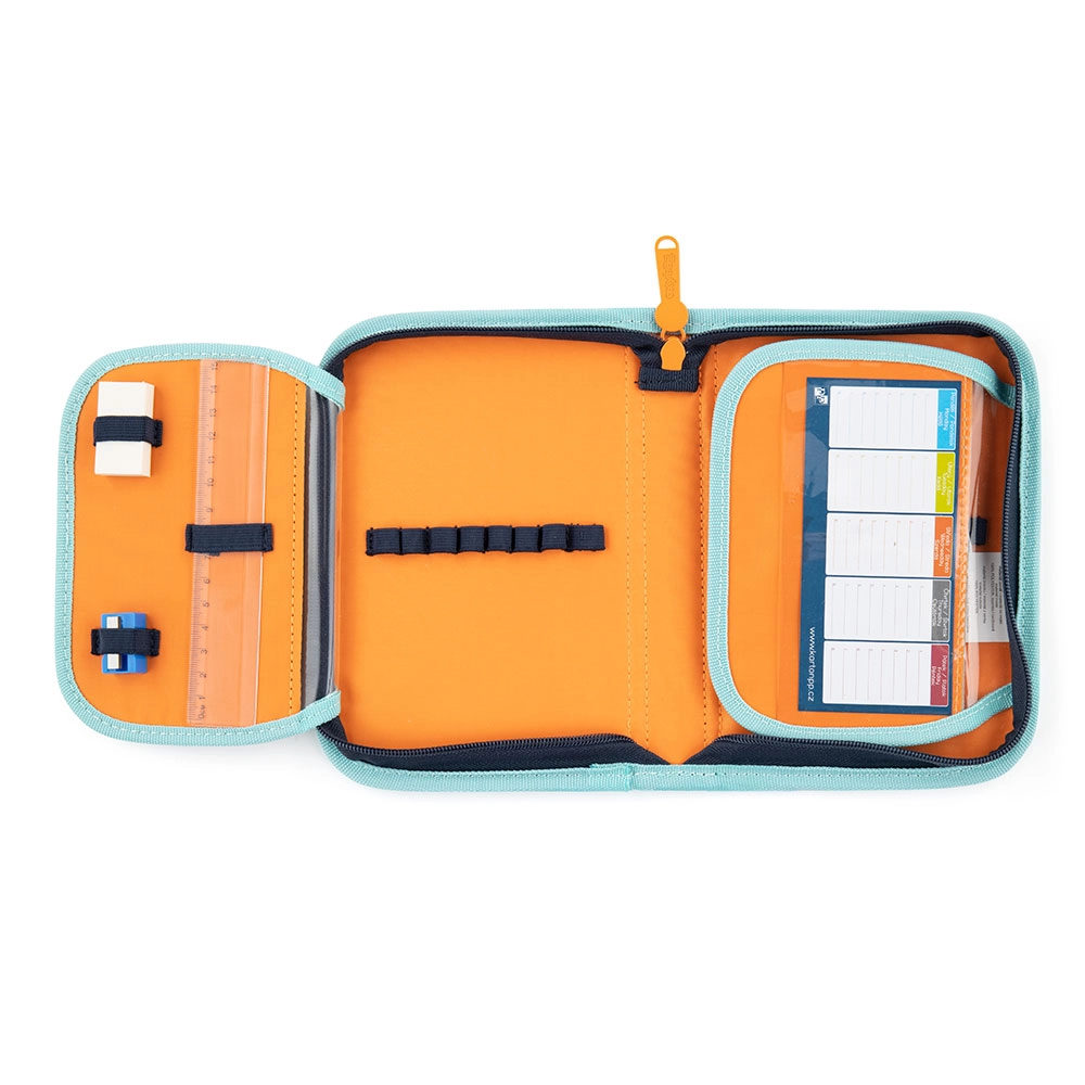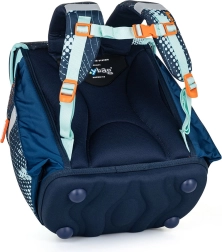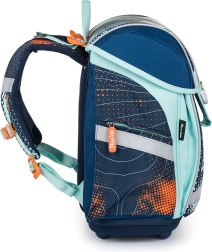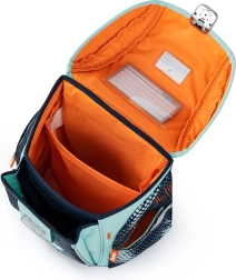 Wewnątrz plecaka znajduje się przejrzysty wewnętrzny organizer i wystarczająca liczba kieszeni na podręczniki, zeszyty i drugie śniadanie. Pojemność 27 l i nośność 8 kg bez trudu pomieszczą codzienny szkolny ekwipunek. W skład zestawu wchodzi także worek na strój ze ściąganymi sznurkami oraz jednopoziomowy piórnik z dwiema klapkami i gumkami do przejrzystej organizacji przyborów piśmiennych.