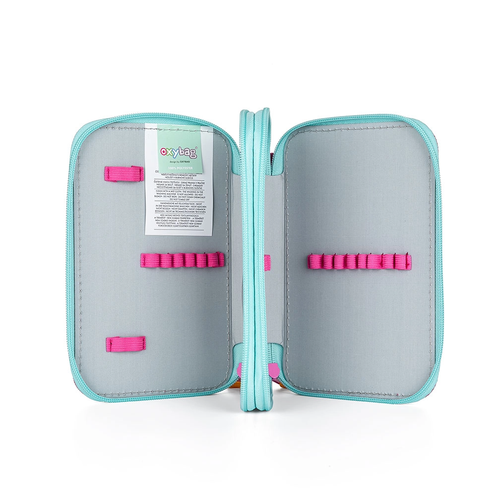 Dzięki przemyślanemu układowi wnętrza z 25 uchwytami łatwo uporządkujesz ołówki, kredki, gumkę oraz linijkę. Duże suwaki przy zamku umożliwiają wygodne otwieranie nawet młodszym dzieciom, a przezroczysta kieszeń na plan pomaga w organizacji szkolnego tygodnia.