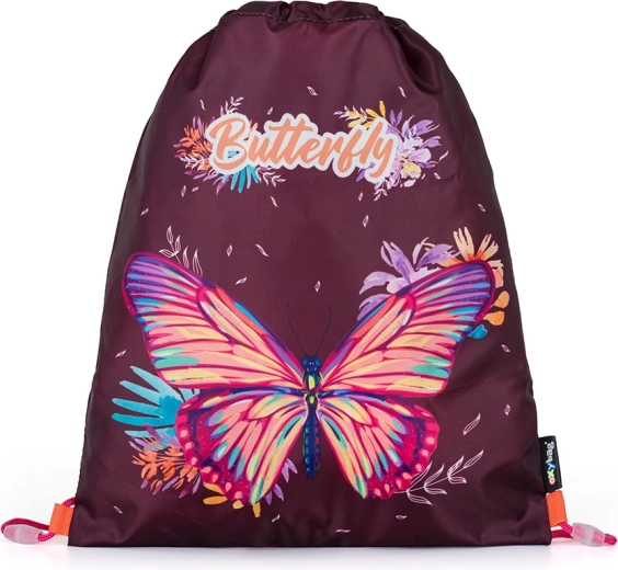 Stylowy i lekki worek na obuwie zmienne lub strój na WF z motywem motyla ucieszy dzieci i rodziców. Dzięki ściąganym sznurkom szybko się zamyka i bezpiecznie trzyma zawartość. Można go nosić jak plecak na plecach lub łatwo przypiąć do plecaka szkolnego.