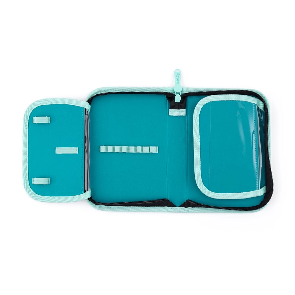 Jednopoziomowy szkolny piórnik z 2 klapkami, pusty, zawiera 25 gumowych uchwytów do mocowania artykułów piśmienniczych. Na wewnętrznych klapkach znajdują się przezroczyste folie na plan lekcji.