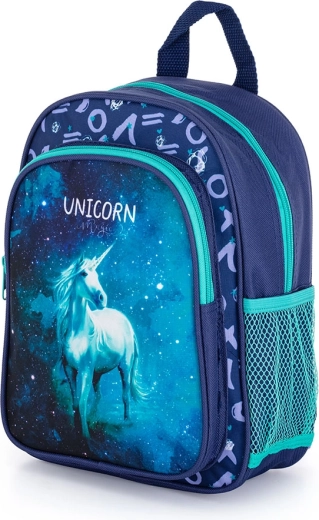 Lekki i wygodny dziecięcy plecak z magicznym motywem jednorożca ucieszy małych odkrywców w wieku od 3 do 6 lat. Oferuje pojemną główną komorę, przednią kieszeń na przekąskę oraz boczną siatkową kieszeń na butelkę. Dzięki regulowanym, wyściełanym szelkom i trwałemu materiałowi tekstylnemu idealnie sprawdzi się do przedszkola, na zajęcia i wycieczki.