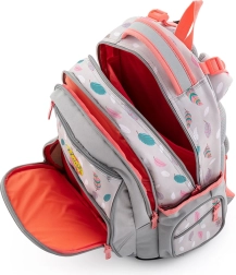 Dwie pojemne wewnętrzne kieszenie, liczne mniejsze przegródki oraz dwie boczne kieszenie ułatwiają uporządkowane przechowywanie podręczników, zeszytów i drobiazgów.