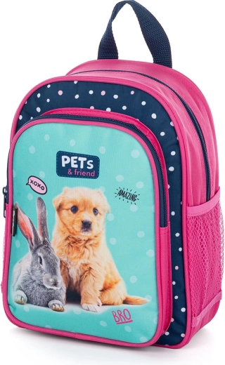 Lekki i wygodny dziecięcy plecak z motywem zwierzątek dla przedszkolaków w wieku od 3 do 6 lat. Oferuje jedną przestronną komorę główną, mniejszą kieszeń na przekąskę oraz boczne kieszonki na butelkę. Idealny na zajęcia, wycieczki i do przedszkola.
