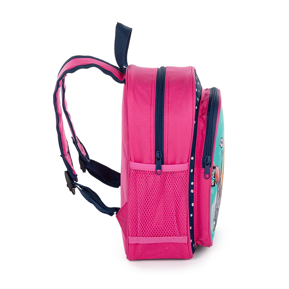 Przemyślany układ kieszeni zapewnia porządek i łatwy dostęp. Główna komora pomieści ubranie lub zabawkę, mniejsza kieszeń jest idealna na przekąskę, a boczne kieszonki bezpiecznie utrzymają butelkę z napojem.