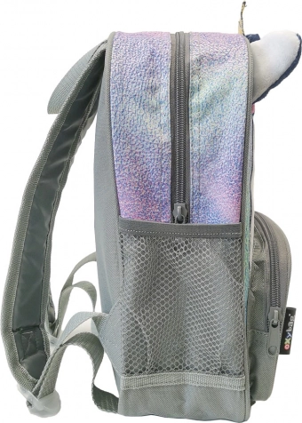 Plecak posiada jedną dużą główną komorę na ubranie lub zabawkę, mniejszą przednią kieszeń na przekąskę oraz boczne kieszonki na butelkę z napojem. Kompaktowe wymiary i niska waga są idealne dla małych pleców.