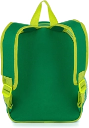 Jaskrawozielony plecak z napisem DINOSAUR motywuje dzieci do samodzielnego noszenia rzeczy i wyróżnia się na placu zabaw oraz w przedszkolu.
