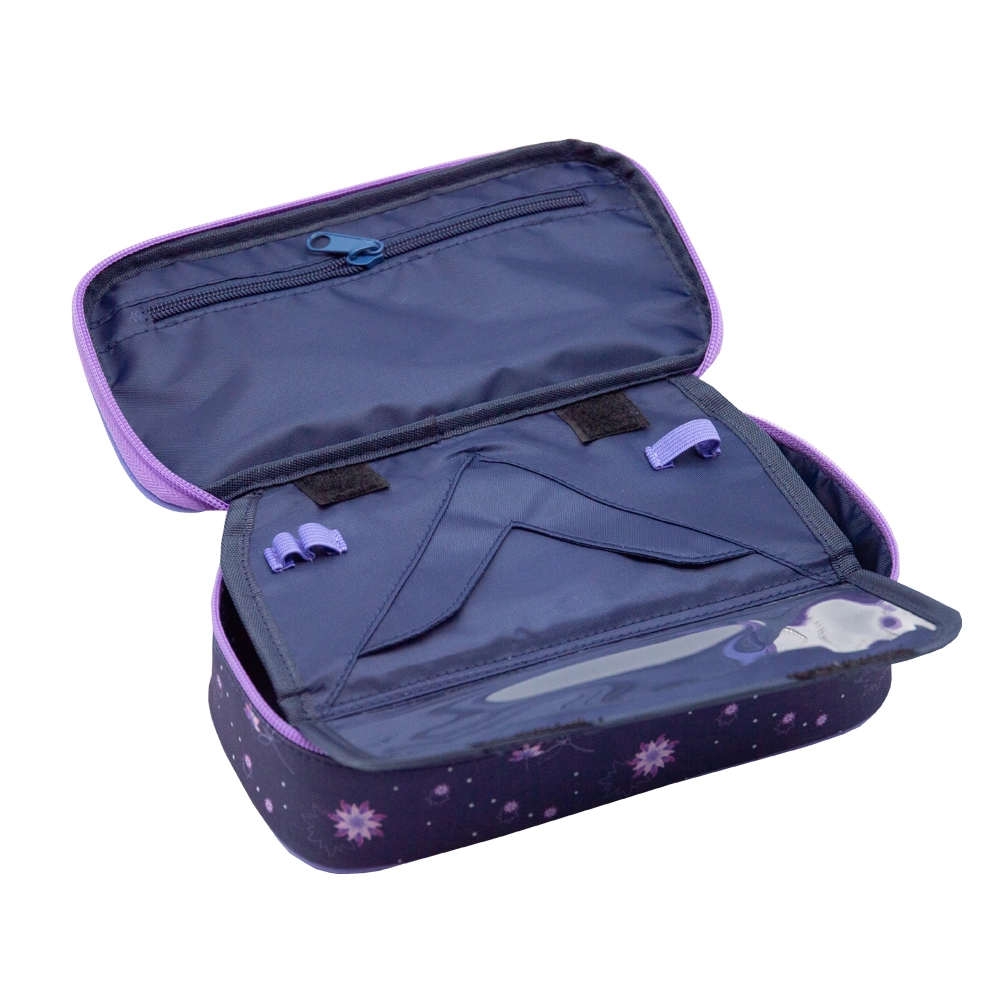 Pod klapką znajduje się przestrzeń na luźne drobiazgi, a uchwyty mieszczą najczęściej używane długopisy i ołówki. Wytrzymałe zamki i wysokiej jakości materiał zapewniają długą żywotność nawet przy codziennym użytkowaniu.