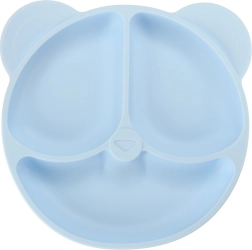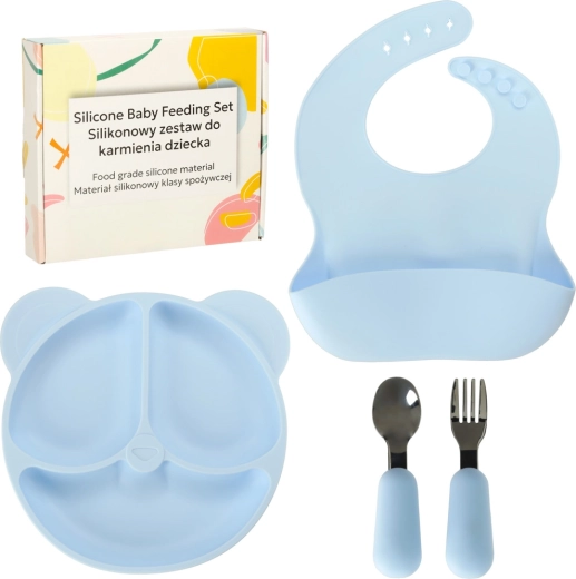 Praktyczny, 4-częściowy silikonowy zestaw naczyń dla dzieci w kolorze niebieskim z uroczym motywem misia zapewnia wygodne i bezpieczne posiłki. Zawiera dzielony talerz, śliniak z kieszonką oraz ergonomiczne sztućce z antypoślizgowym wykończeniem. Wykonany z silikonu przeznaczonego do kontaktu z żywnością, wolnego od szkodliwych substancji; łatwy w czyszczeniu i wspiera samodzielne jedzenie.
