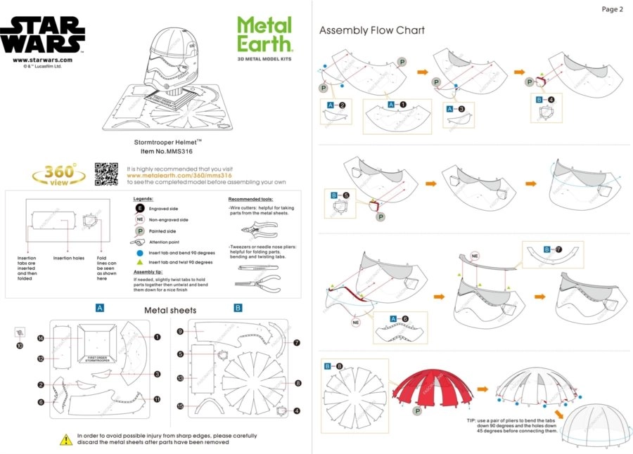 Wyjmij poszczególne elementy z metalowych arkuszy; w razie potrzeby użyj małych cążek tnących (nie wchodzą w skład zestawu). Elementy łączy się za pomocą zamków tworzonych przez zaczep (języczek) i otwór. Zegnij języczek przy użyciu małych, cienkich szczypiec (nie wchodzą w skład zestawu) i stopniowo połącz wszystkie zamki, aż powstanie bardzo realistyczne, mistrzowskie dzieło!