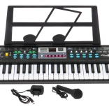 W zestawie: klawisze, zasilacz sieciowy, mikrofon, pulpit na nuty. Zasilanie z sieci (zasilacz w komplecie) lub 6× AA 1,5 V (brak w zestawie).