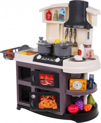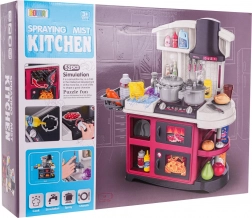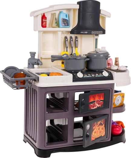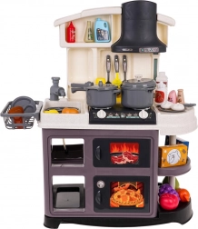 Ta plastikowa kuchnia jest świetnie wykonana i wyposażona we wszystko, czego dzieci potrzebują do zabawy w gotowanie. Po przekręceniu pokręteł rozlegają się realistyczne dźwięki gotowania i smażenia, a palniki się podświetlają. Po dodaniu kilku kropel wody powstaje delikatna zimna para, która potęguje wrażenie prawdziwego gotowania. Kran naprawdę działa, więc dzieci mogą „zmywać” naczynia w zlewie.