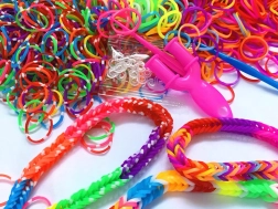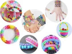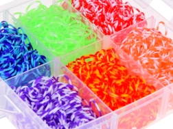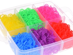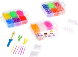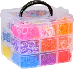 - ok. 4500 szt. gumek, przezroczyste łączniki, kolorowe/pastelowe koraliki, 6× małe szydełka, 1× duże szydełko, 2× procówka, 2× krosno, 6× silikonowy breloczek, przezroczysty organizer z przegródkami