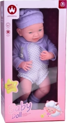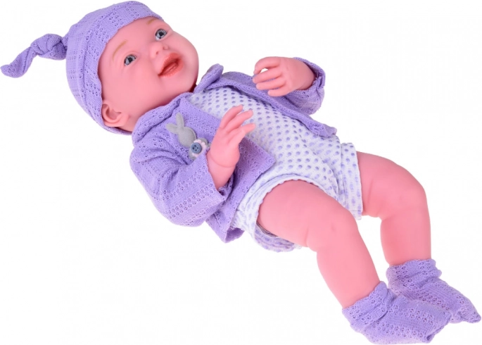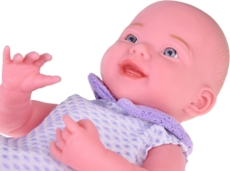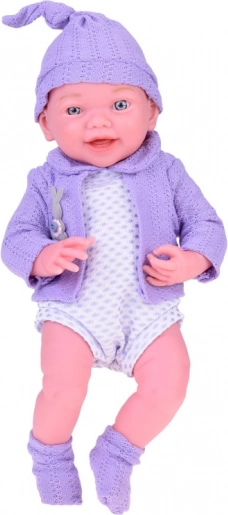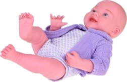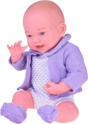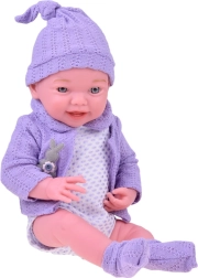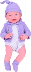 W komplecie stylowa wyprawka: jasne body z fioletowym wzorem, miękki dziany sweterek, czapeczka i skarpetki doskonale dopasowane w jeden zestaw. Lalka to świetny prezent dla dzieci, które lubią opiekę nad niemowlęciem i rozwijają podczas zabawy swoje umiejętności społeczne.