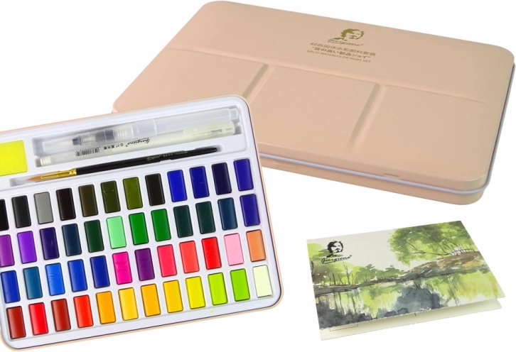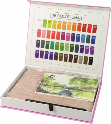 Kompletny zestaw akwarelowy dla dzieci i dorosłych z 48 żywymi kolorami, praktycznym pędzlem wodnym, pędzlami i gąbeczką, dwoma finelinerami (czarny i biały) oraz pocztówkami do malowania. Przechowywany w eleganckim różowym metalowym etui w magnetycznym opakowaniu. Certyfikaty CE, norma EN71, odpowiedni od 3 lat.