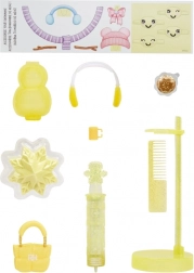 - Bogate akcesoria w żółtym tonie: zimowe dodatki, torebka, grzebień i stojak.
