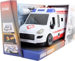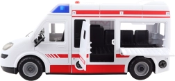 Model jest zasilany 3× AG13 (w zestawie) i oferuje cztery tryby dźwiękowe – syrena, klakson, uruchamianie silnika i melodia. Otwierane drzwi po stronie kierowcy i z tyłu ułatwiają załadunek „pacjentów” na nosze oraz dostęp do kabiny.