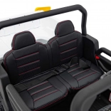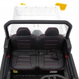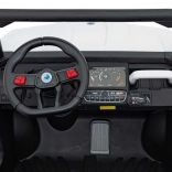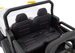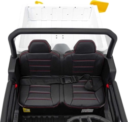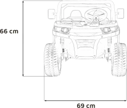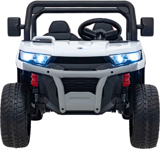 Rodzice docenią pełną kontrolę dzięki pilotowi 2,4 GHz z przyciskiem awaryjnego zatrzymania, a dzieci – wygodę siedzenia z eko-skóry o wymiarach 41×21×27 cm, miękkie opony EVA 27×11 cm, realistyczne dźwięki w kierownicy i jasne reflektory LED. Maksymalne obciążenie to 50 kg, więc jazdą cieszą się także starsze dzieci.