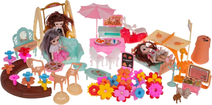W komplecie w pełni wyposażone meble, ogrodowa huśtawka, parasol, zwierzątka oraz skuter. Trzy lalki mają ruchome kończyny i długie włosy idealne do czesania.