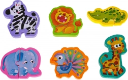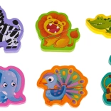 W zestawie znajdują się drewniane figurki zwierząt: zebra, lew, słoń, paw, żyrafa i krokodyl. Świetne do samodzielnej zabawy oraz wspólnego tworzenia z rodzicami.
