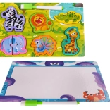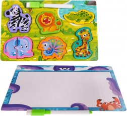 - Dwustronna drewniana tablica, mazak suchościeralny z gumką, drewniane puzzle ze zwierzątkami