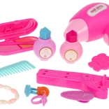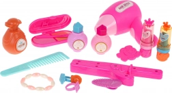 W komplecie znajduje się suszarka, prostownica, kasetka kosmetyczna, grzebień, perfumy, lakiery, pomadki, pierścionki, spinki, bransoletka i naklejki – wszystko do pełnej metamorfozy.