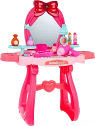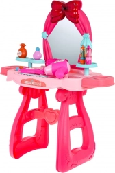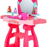 Stylowa różowa toaletka z dużym lustrem i ikoniczną kokardą ucieszy każde dziecko, które kocha zabawy w odgrywanie ról. W zestawie znajdziesz bogaty komplet akcesoriów – od suszarki i prostownicy do włosów po pomadki, lakiery, pierścionki i bransoletkę. Lustro wyposażono w inteligentną indukcję – przy ruchu aktywują się efekty świetlne i melodie.