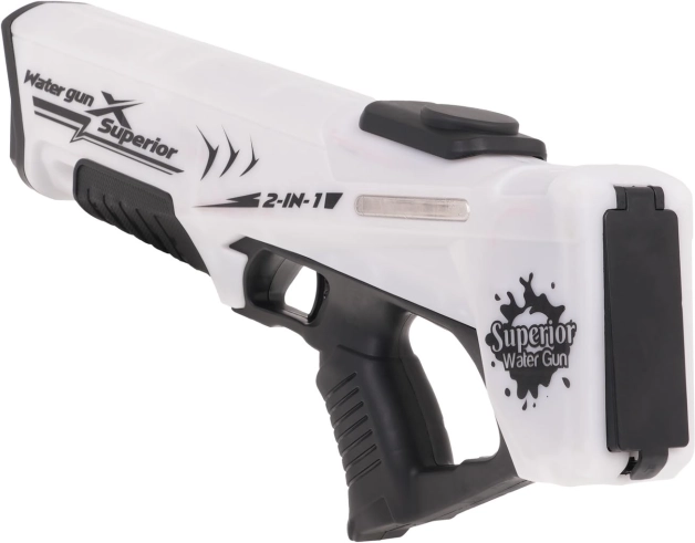 Zabawny elektryczny pistolet na wodę dla dzieci od 6 lat z efektami świetlnymi i trybem 2 w 1 – można strzelać na akumulator oraz ręcznie. Wytrzymała konstrukcja, łatwe napełnianie górnego zbiornika oraz podświetlenie LED do wodnych bitew także o zmierzchu.