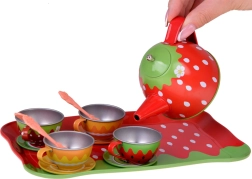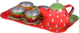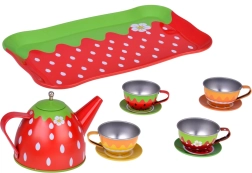 Czajniczek, filiżanki, spodki i taca z metalu są lekkie, trwałe i świetnie leżą w dziecięcych rączkach. Truskawkowy design nada każdemu podwieczorkowi czarujący klimat.