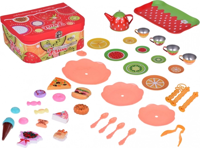 Dziecięcy zestaw do herbaty z owocowym motywem wykonany jest z trwałego metalu (czajniczek, filiżanki, spodki, taca) i uzupełniony plastikową trzypoziomową etażerką oraz bogatym zestawem słodkich i słonych smakołyków. Wszystko mieści się w atrakcyjnym kuferku – idealnym do przechowywania i przenoszenia.