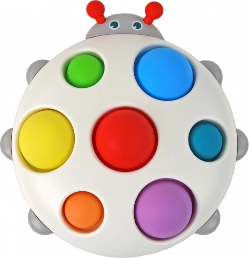 Ta sensoryczna tablica Pop It w kształcie uroczej biedronki została zaprojektowana dla dzieci od najwcześniejszego wieku. Siedem wyrazistych kolorów (żółty, zielony, czerwony, pomarańczowy, żółty, niebieski i turkusowy) stymuluje wzrok, a przyjemny opór silikonowych bąbelków rozwija dotyk oraz koordynację oko–ręka. Świetna w podróży, do kącika wyciszenia i do codziennej zabawy bez bałaganu.
