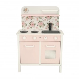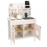Kombinacja delikatnego różowego koloru i kwiatowych wzorów czyni kuchnię nie tylko zabawką, ale także pięknym elementem dekoracyjnym.