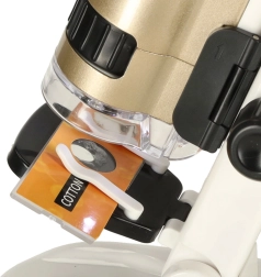 Mikroskop zbudowany jest na stabilnej podstawie z lampką LED, zapewniającą równomierne oświetlenie. Dzięki dwóm stopniom powiększenia – 100x i 250x – możliwe jest obserwowanie struktur włókien, komórek i innych materiałów w najdrobniejszych szczegółach.