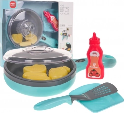W zestawie znajdziesz patelnię z przezroczystą pokrywką, łopatkę, talerzyk, butelkę „ketchupu” oraz produkty spożywcze (ryba, stek, parówki) – wszystko gotowe na wymyśloną ucztę.