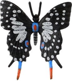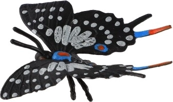Ten wysokiej jakości model motyla oddaje typowe cechy rodzaju Papilio – eleganckie czarne skrzydła z białymi plamkami oraz subtelnymi niebieskimi i czerwonymi akcentami. Dzięki realistycznemu wykonaniu stanowi znakomity dodatek dla miłośników przyrody, szkół i muzeów.
