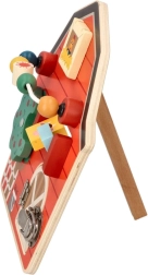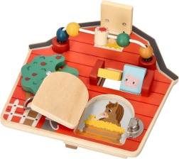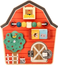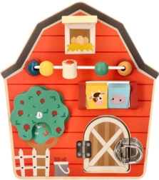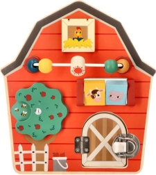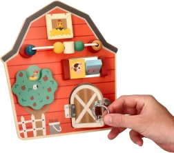 Ta drewniana aktywna tablica w kształcie stodoły została zaprojektowana, aby pobudzać małą motorykę i zapewniać dzieciom świetną zabawę. Dzięki barwnej, farmerskiej tematyce i kolorom nie tylko uczy, ale też bawi najmłodszych członków rodziny. Elementy interaktywne, takie jak przesuwane koraliki, obracane drzewo i drzwiczki z zasuwką, pomagają rozwijać koordynację ręka-oko.