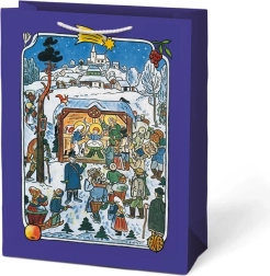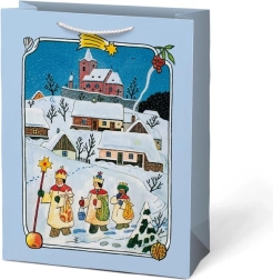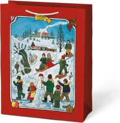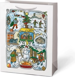 Elegancka papierowa świąteczna torba w rozmiarze L z unikalnymi ilustracjami Josefa Lady doda każdemu prezentowi uroku tradycji. Ma mocny sznurkowy uchwyt dla wygodnego noszenia, zawieszkę na dedykację oraz wysokiej jakości lokalny lakier UV, który zapewnia piękny połysk i trwałość. Dostępna w czterech zimowych motywach i kolorach – białym, czerwonym, jasnoniebieskim, granatowym – wysyłamy według dostępności magazynowej.