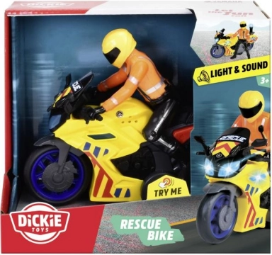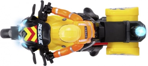 Ciesz się akcją ratunkową z tą motocyklem ratunkowym o długości 17 cm, wyposażonym w światło, dźwięk oraz ruchomą figurkę kierowcy.