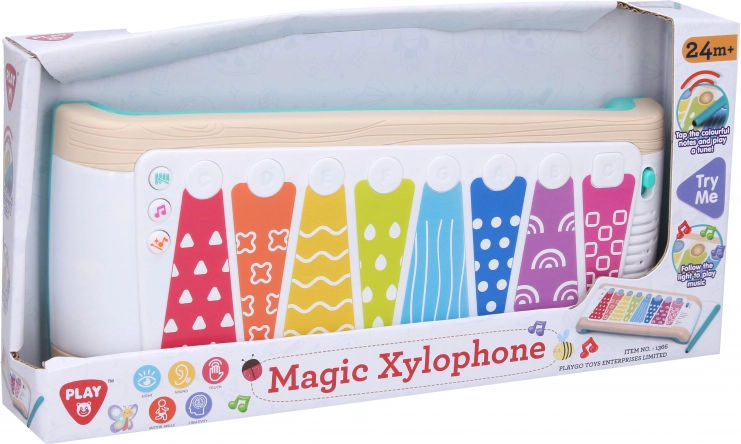 Zabawny dotykowy ksylofon dla najmłodszych z kolorowymi klawiszami, efektami świetlnymi i dźwiękowymi oraz 3 trybami gry. Baterie w zestawie, regulacja głośności, od 12 miesięcy.