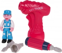 W zestawie figurka kierowcy, dziecięca wiertarka/śrubokręt oraz 3 wymienne bity (płaski, krzyżowy, sześciokątny) do realistycznej zabawy w małego mechanika.