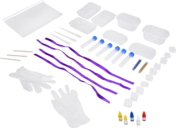 W skład zestawu wchodzi książeczka w języku angielskim z dokładnym opisem składników, procesu powstawania mydła, mieszania kolorów i ciekawostek oraz różne pomysły na tworzenie mydeł. Podczas przygotowania mydeł dzieci rozwijają swoje umiejętności manualne, szczególnie przy wlewaniu mydła do form, mieszaniu składników i precyzyjnym dozowaniu barwników. Zestaw wprowadza dzieci w podstawowe pojęcia chemiczne jak topienie, mieszanie składników i proces twardnienia mydła, co zachęca do zainteresowania nauką.