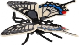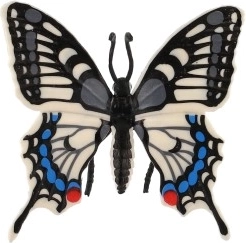 Ten dekoracyjny motyl inspirowany gatunkiem paź królowej (Papilio machaon) wyróżnia się precyzyjnym odwzorowaniem skrzydeł z kontrastowymi wzorami w czerni, bieli i niebieskim. Realistyczny wygląd wprowadzi naturalną atmosferę do pokoju dziecięcego, gabinetu czy salonu.
